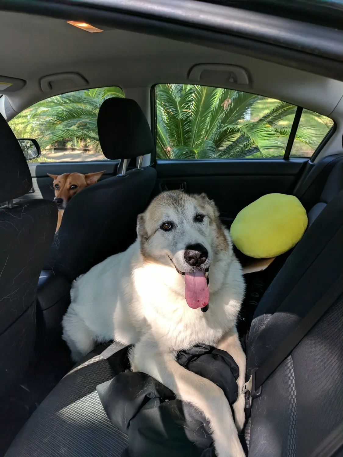 The first photo, though, shows my roommates' dogs nestled snugly in my car. As if, and don't tell me otherwise, they're planning to join me cross country. Wouldn't that make this even more of an adventure?